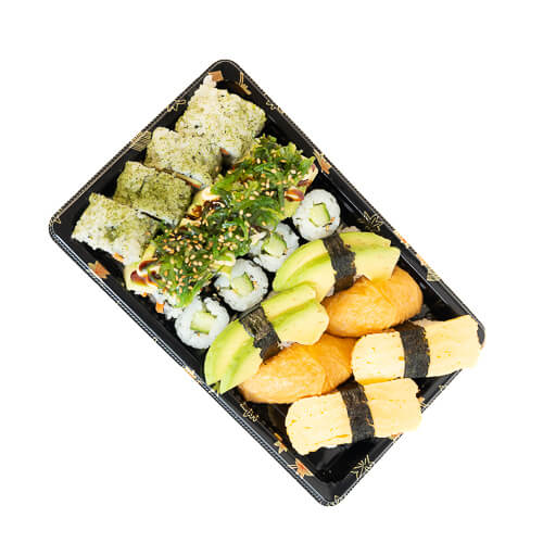 2 zalm nigiri ,2 tuna nigiri, 2 ebi nigiri, 2 tamago nigiri , 2 surimi nigiri , 2 tofu nigiri , 8 komkomer maki,8 zalm maki ,8 tuna maki , 8 California roll,8 dragon ebi roll