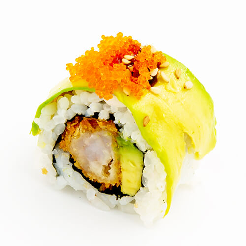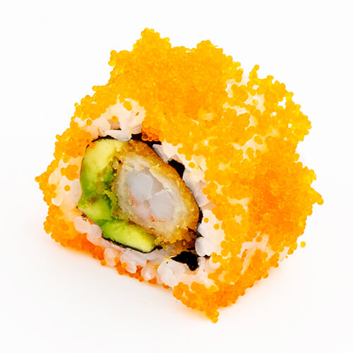 In de rol: gefrituurde garnalen, avocado en mayonaise. Op de rol: oranje masago