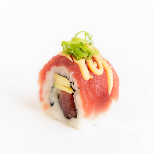 In de rol: tonijn en avocado. Op de rol: chilipoeder en pikante saus